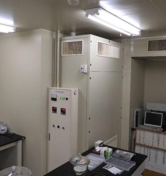 この方式が多いのは、建築会社が恒温恒湿室等も含めて設計した場合で、そのほとんどが、建物の天井から空調機を吊って、その下に断熱パネルのお部屋を設置しております。