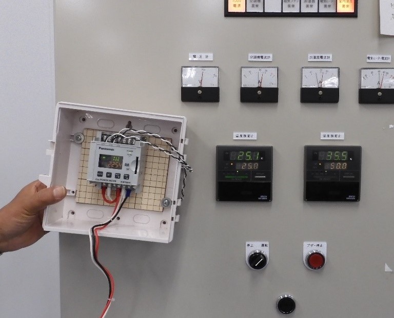 交換後に試運転を行い、設定温湿度に近い25.1℃/50.1%に到達した時に、消費電力を測定した時の写真です。