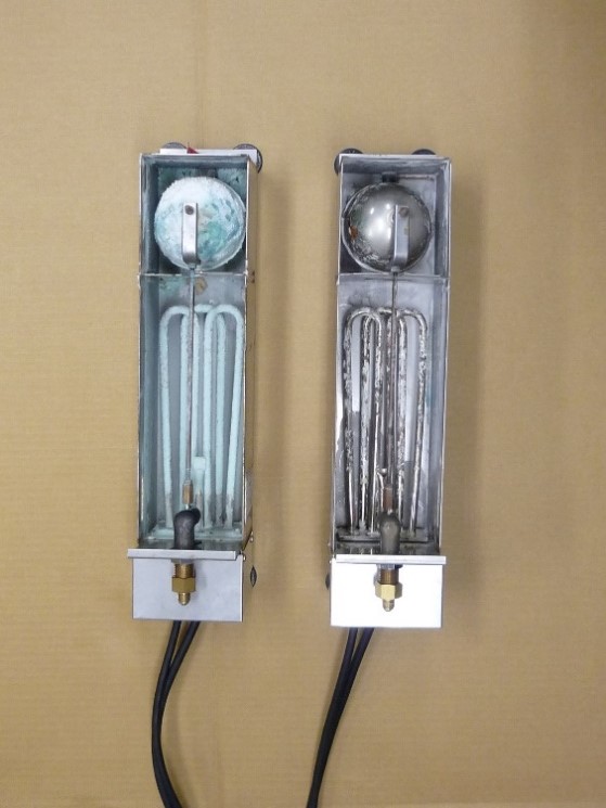 右側は、回収した加湿器のスケールを削り取ってオーバーホールした物です。メッキは一部剥げておりますが、使用上問題は有りません。
