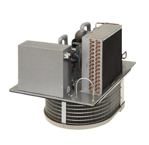 一番簡単な例は、断熱された小部屋の天井に、写真の様なユニットを乗せただけの物です。上が冷凍機で、下が冷却コイルと送風機です。