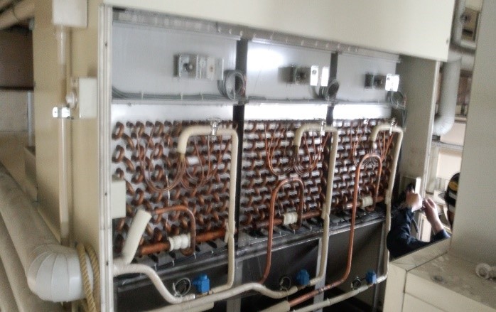 一般の空調機と比べると、様々な工夫がされており、複雑ですが、霜取休止しないので、低温でも安定した温湿度が得られる空調機です。
