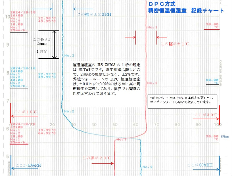 このチャートをお見せしますと、現在試験室をお持ちのお客様や、空調に詳しい人ほど、運転条件を変更しても、全くオーバーシュートしていないし、こんな高精度が出せるのは、絶対に有り得ない、これは捏造したチャートではないのかと疑われてしまいます。