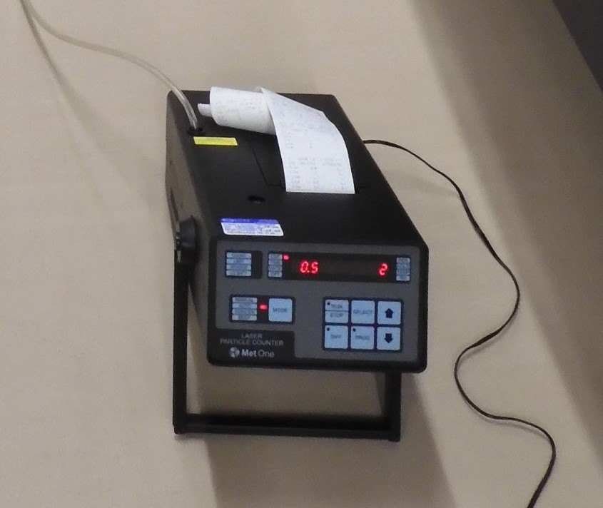 クリーンルーム、クリーンブースの清浄度の測定は、完成後にパーティクルカウンタを使用して、室内の浮遊微粒子がどのくらいあるかを測定して、定められた基準値の中に納まっているかを確認します。