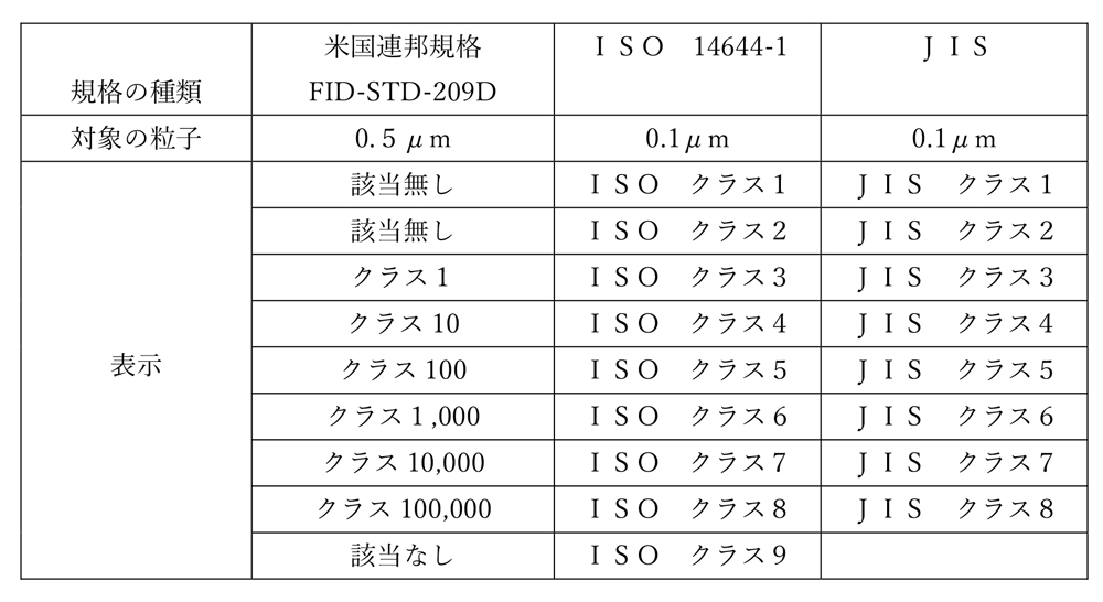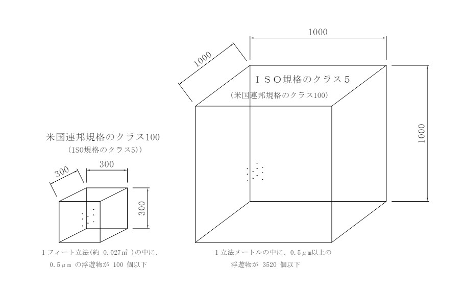 米国連邦規格は、1フィート立法メートの中に、0.5μm以上の大きさのホコリが、何個有るかで表示します。例えば、クラス100と言えば、0.5μm以上の大きさのホコリが100個未満存在すると状態を示します。