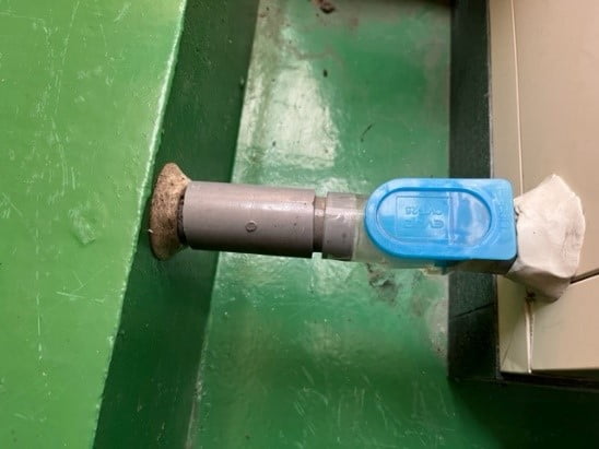 また、屋外の雨水排水に流しても排水管から虫が入り込みますので、空調機の排水の出口には下の写真の様な逆流を防止するトラップが取付されております。このトラップは必ず取付しないと、試験室内に下水の臭いや小さな虫が入り込む事になります。