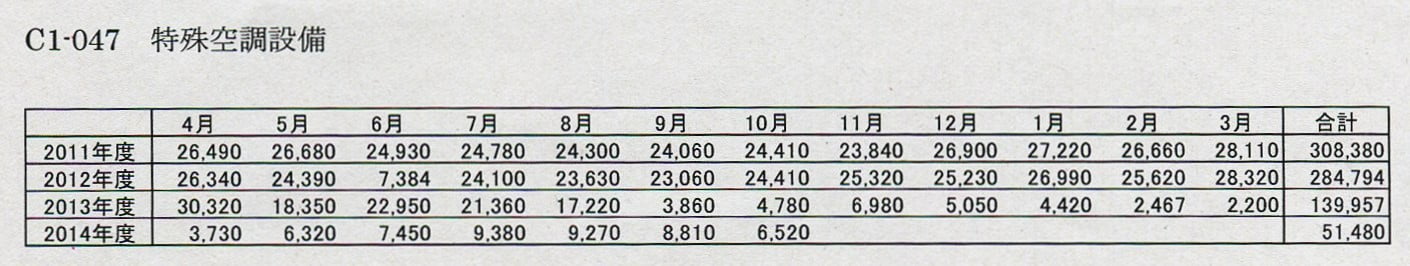 2011年4月~2013年8月迄の1日当たりの消費電力は、平均で25kW消費しておりましたが、2013年9月の改造後~2014年10月迄は、平均で6.2kWに低下しております。