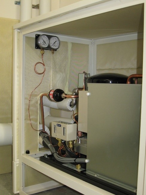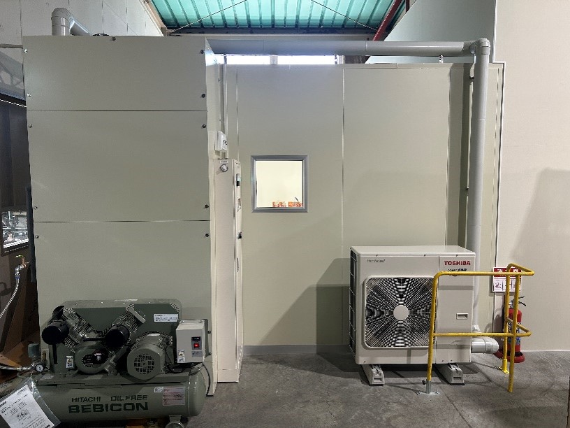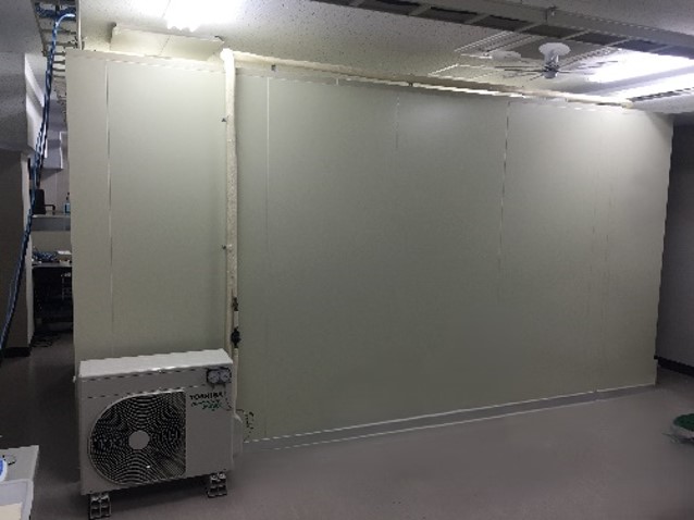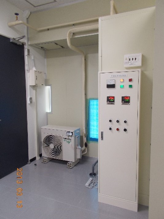 設置場所が空調の無い工場内の場合や、大きな空調設備が有る場所、試験室が小型で、冷凍機の発熱が少ない場合は、試験室を設置した場所の近くの室内に、冷凍機を設置している例も有ります。