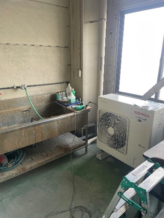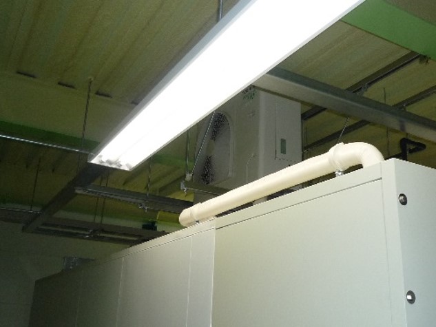 この様に、広い工場内や、大きな空調設備が有る場合、夏季は窓を開けられる状態の研究室等では、室内に冷凍機を設置している例も有ります。