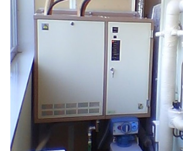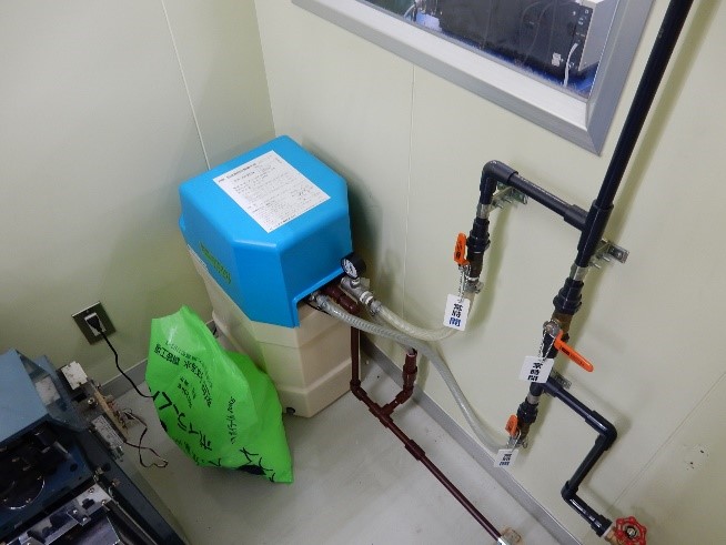下の写真は軟水器です。スケール対策として使用されている例は多く有ります。定期的に、内部の塩の追加が必要ですから、メンテナンス会社が定期点検をされている現場では、良く見かける方法です。
