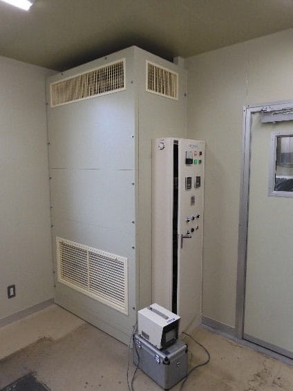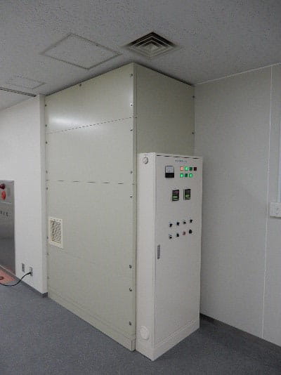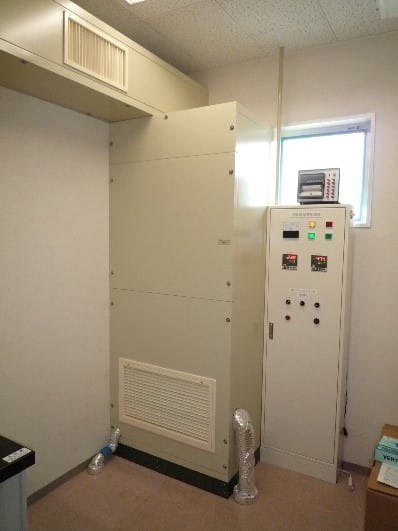 次の写真は、事務所の一角に有った一般空調用のパッケージエアコンを取外して、そこに恒温恒湿室用の空調を設置した例です。天井の吹出口と天井裏のダクトは、そのまま既存の設備を再利用しています。
