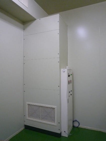 既存の建物の中に恒温恒湿室のパネルをギリギリに設置すると、メンテナンスを考えると空調機を置ける場所は何処にも無い場合が有ります。離れた機械室に置いてダクトで結ぶ例も有りますが、コンクリートの壁を壊してお部屋と空調機をダクトで接続して保温したりすると、意外に費用がかかります。また、ダクトを伸ばすと熱と送風のロスも多くなります。
