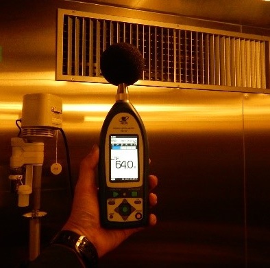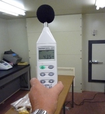 これは防音室で、特に室内の低騒音を希望された試験室で、実際に、運転中の騒音を測定している写真です。