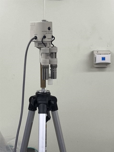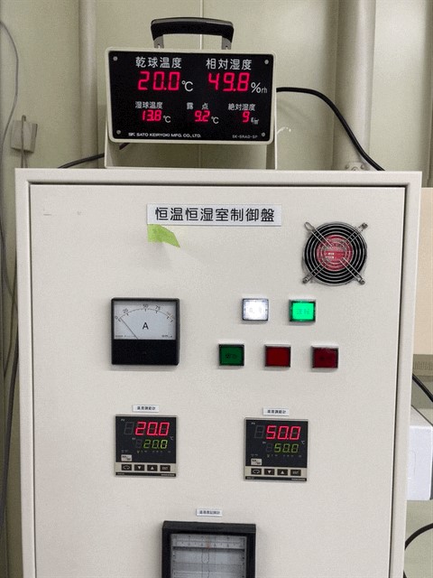 制御盤の上に載っているのが、気象庁検体付きの温湿度の測定器です。温湿度の精度を確認している所です。