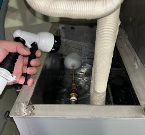 空調機の内部は、写真の様に、お客様でも簡単に洗浄ができる様に、空調機内部を水洗する為のノズルキットが、標準で付属しております。