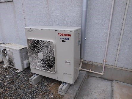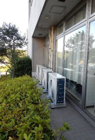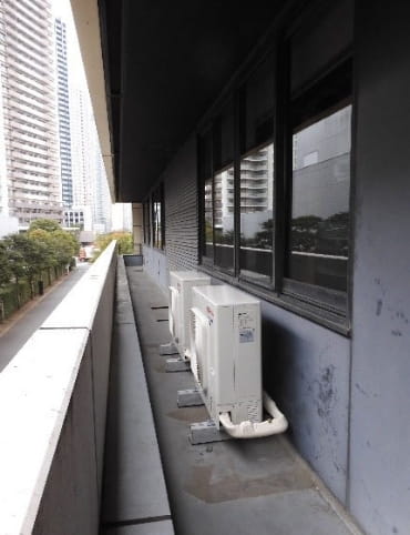 2階設置でも設置場所は窓際か壁際が良く、冷凍機はベランダか地上あるいは建物の壁です。