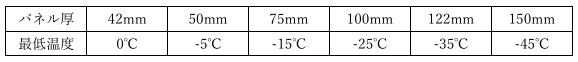 断熱バネルの厚さは、6種類有ります。運転温度によって使用するパネルの厚さが変わり、下記の表の様になります。高温側は多湿にしない限り結露しないので、特に規定は有りませんが、薄いと、パネルの外側が少し熱くなります。