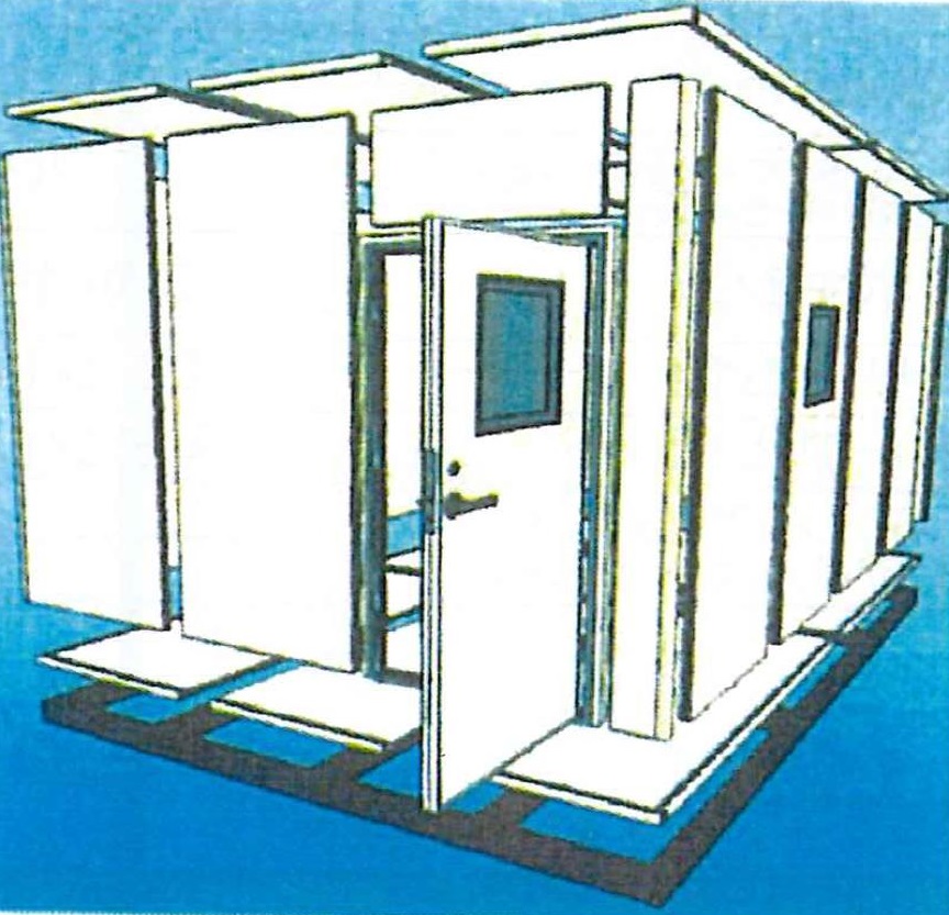 広いお部屋も製作できますが、天井に補強材を入れても中央部が下って来ます。広いお部屋では、設置場所の天井スラブや建屋の骨組みから、ボルトで天井を吊らせていただきます。