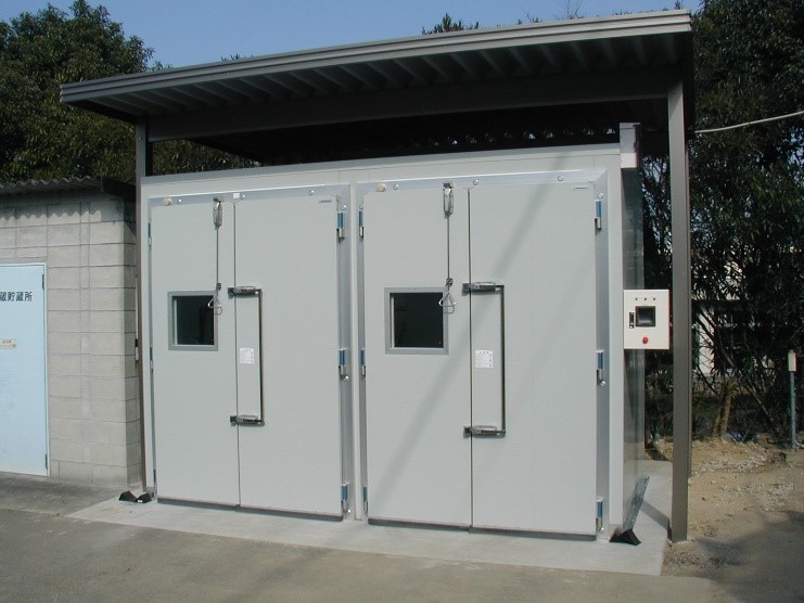 屋外に設置を希望される場合は、その場所に、プレハブ小屋か、柱と屋根だけでも良いので、物品の置場を、お客様に出入りの建築業者様に作っていただいて、この中に試験室を設置している例が、何件か有ります。