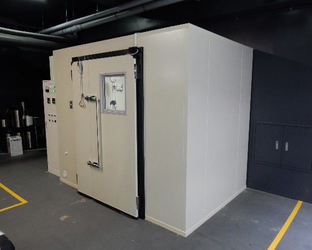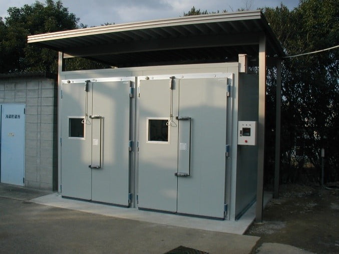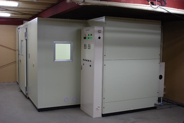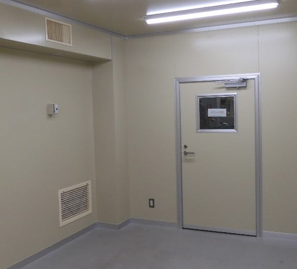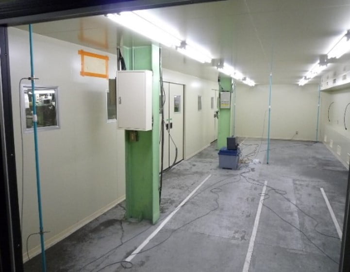 お客様の計画図を見ると、試験室の周囲に人が通れる600程度のスペースを見ている例が良く有ります。特に周囲に人が通る必要が無ければ、試験室は壁際に設置する事が出来ます。
