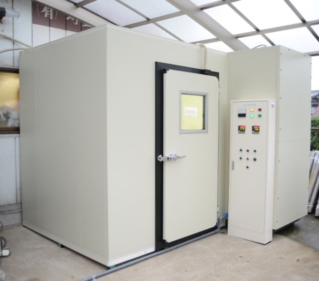 但し、過酷な多湿条件の環境試験室では、柱も断熱パネルで囲わないと、柱に結露します。低温では、見えない柱の内側の方に結露します。この様な運転条件で設置場所に柱が有る場合は、試験室内に取り込んだ柱の周囲を、断熱パネルで囲う必要が有ります。