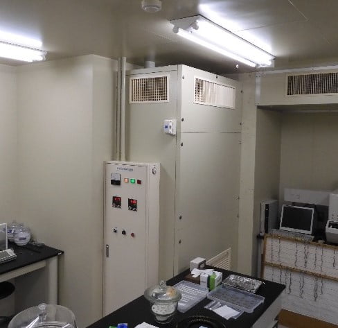天井裏の空調機は、下にある試験室を解体しないと取外せない場合も多く、空調機の入替えでは、既存の装置はそのまま閉鎖してしまい、室内側にコンパクトにまとめた空調機を設置している例も有ります。