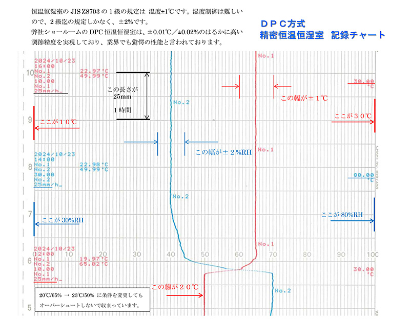 弊社の恒温恒湿室は、特別な事情の無い限り、弊社独自のDPC方式が多く、仕様書の精度では全て、±1℃/±2% が標準です。