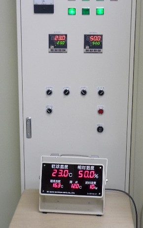 これは、試運転時の写真で、下に見えるのは、気象庁検定付きの温湿度測定器です。この様に測定器にピタリと指示を合わせてお引渡ししております。