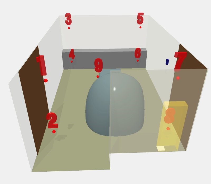 設置場所は、部屋の四隅の上下、壁と床、天井からそれぞれ50cm離れた8ヶ所と、部屋の中央の合計9ヶ所を測定して温度分布を確認します。
