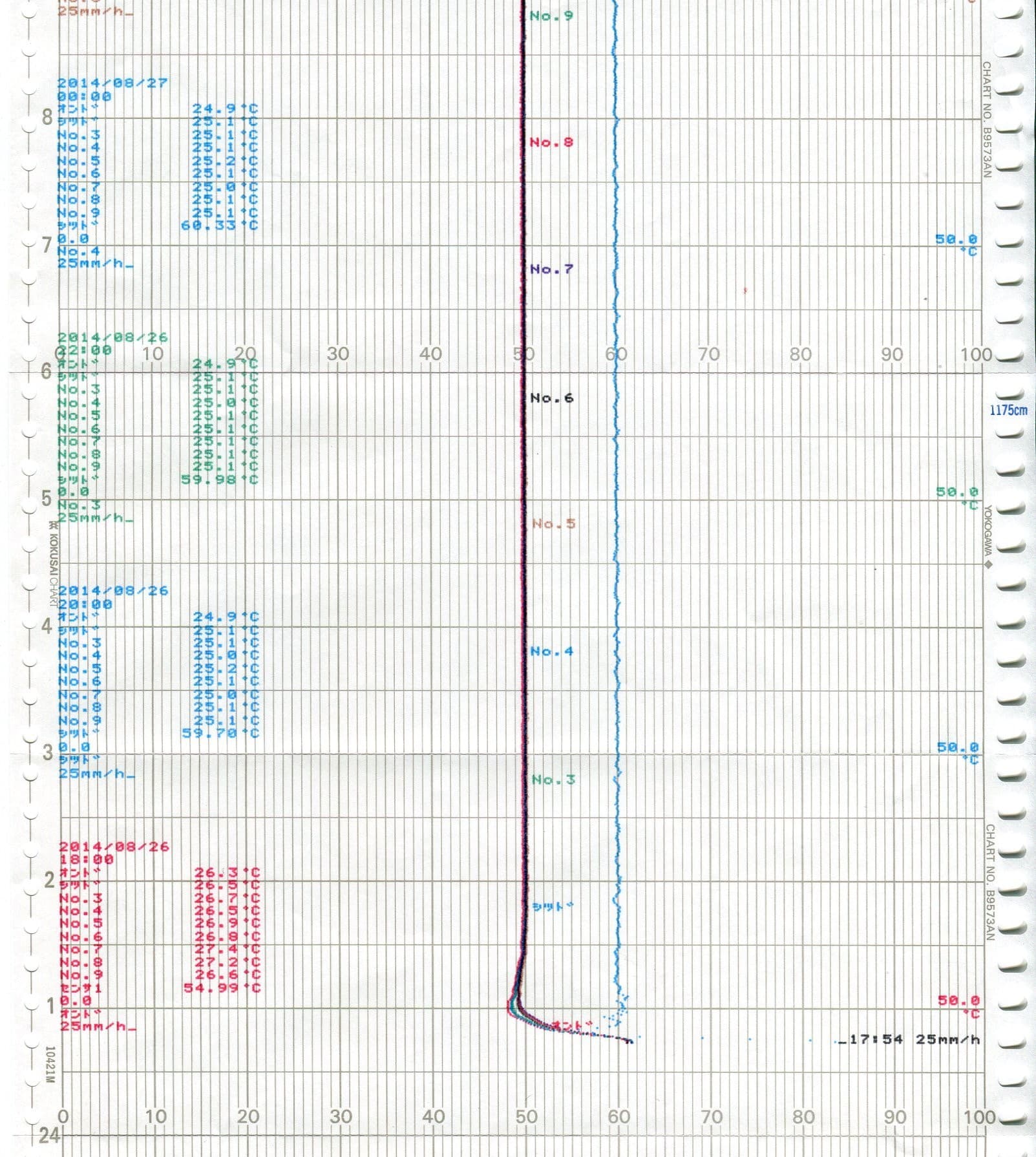 弊社装置の温度変動は0.1℃以内ですが、より正確を期するために同時に9点の温度を測定しております。