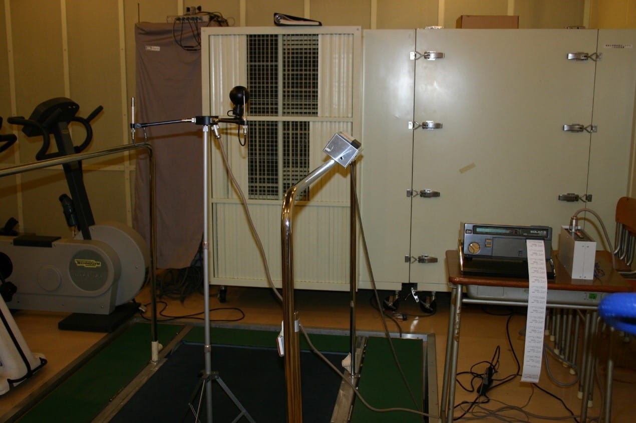 左がエルゴメータ、中央奥が人体送風機、下のベルトがトレッドミルです。ベルトの左右に点灯防止の手摺が見えています。ベルトの上は、輻射熱測定の黒球温度計です。