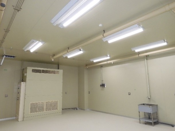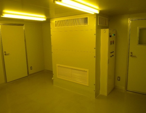 感光材料を取り扱う半導体工場では、ここにクリーンルームを納入する時に、紫外線防止の窓を指定される事が良く有ります。室内には、イエローの照明を点灯して、窓にはイエローの樹脂窓を使用して、外から紫外線が入らない様にしております。