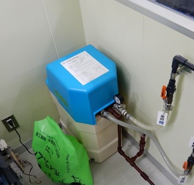下の写真は、軟水器の実装写真です。緑の袋には、再生用の塩が入っております。