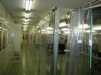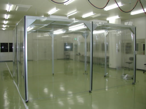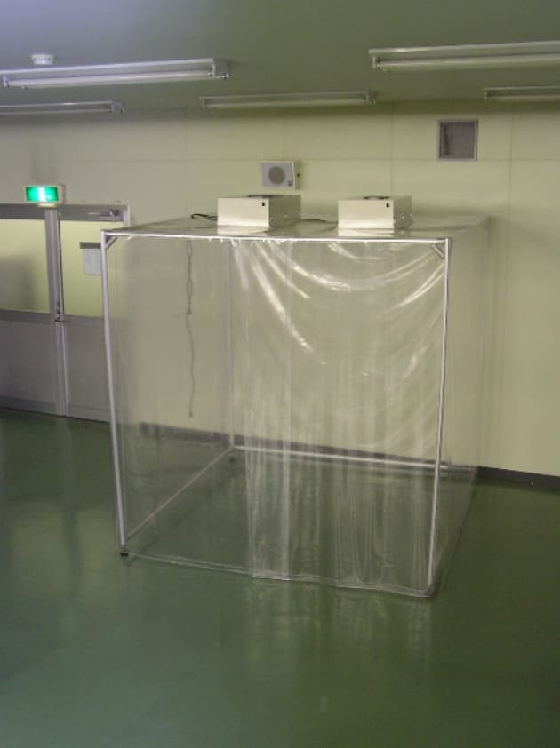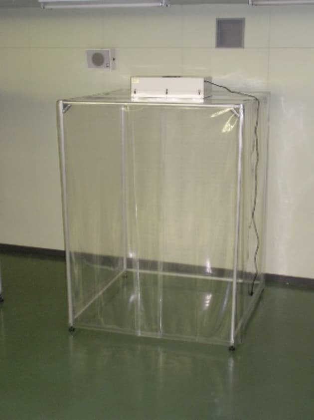 クリーンブースは、写真の様に、アルミのフレームに、静電防止のビニールシートを巻き、天井に、FFU(フィルタ・ファンユニット)を乗せた物です。