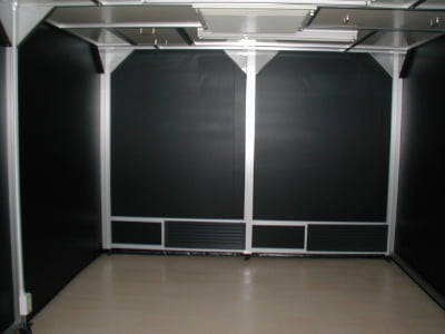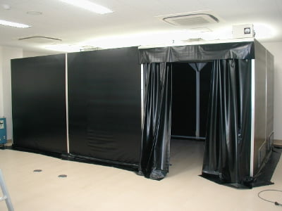 静電防止の透明シートを黒に替えると、この様な暗室仕様も製作できます。この場合は、遮光されたFFUと、遮光の排気ガラリを使用しております。