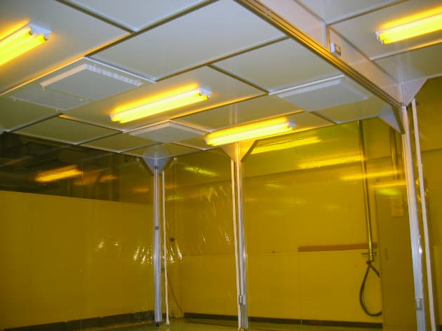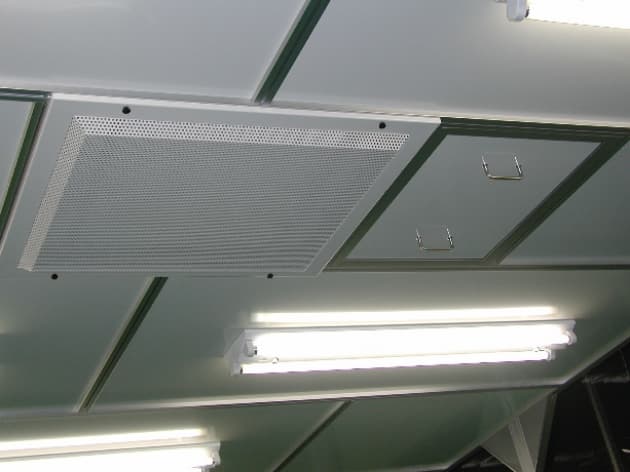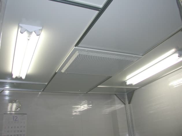 天井の中央に見えているのがFFUです。ブースは部屋の高さに合わせて、ギリギリに高く設置する例が多く、天井の上が狭くなるので、ヘパフィルタは下から交換する方式です。