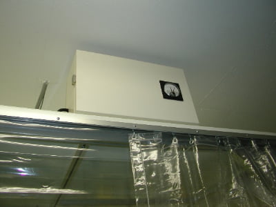 天井の上に載っている、薄い箱状の物がFFUで、ここから天井上の空気を吸い込みます。 プレフィルタ、ヘパフィルタを通してブース内に送り込み、床に近い部分の隙間から排気をさせています。ブース内は陽圧になりますから、外気は入らず、高い清浄度が保てます。