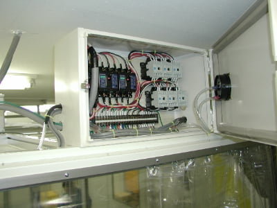 FFUの台数が増えて、100V電源では電気容量が不足する場合は、動力の200Vを使用する例も有り、写真は動力を使用した時の分電盤です。