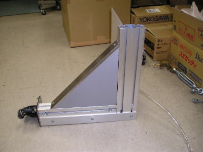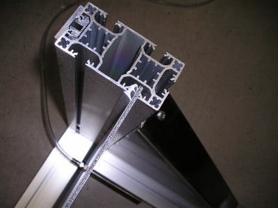 写真の様なアルマイト加工された形成材を使用して、右写真の様に組み合わせて、現場で計画サイズのフレームを製作します。軽くて非常に強く、ひずみが発生し難い構造です。