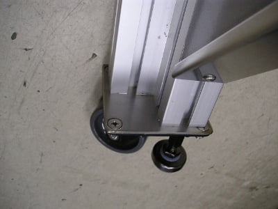 アルミ押出成形材を使用しておりますので、軽くて丈夫です。写真の様に、アルミフレームの下に、オプションのキャスターを取付けすると、フロア内を自由に移動させて、作業効率の良い場所に降ろして使用する事が出来ます。