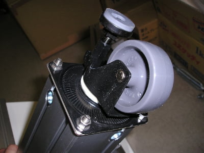 フレームの下に、オプションでこの様なキャスターが取付可能です。アジャスターボルトを下げると、車輪が浮くので、大きなブースでも、移動して希望する場所に降ろして設置する事が出来ます。