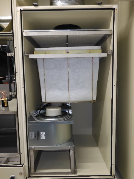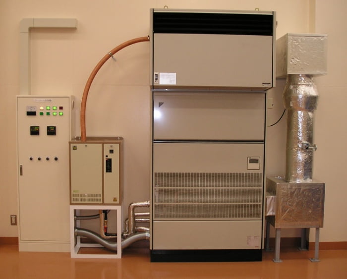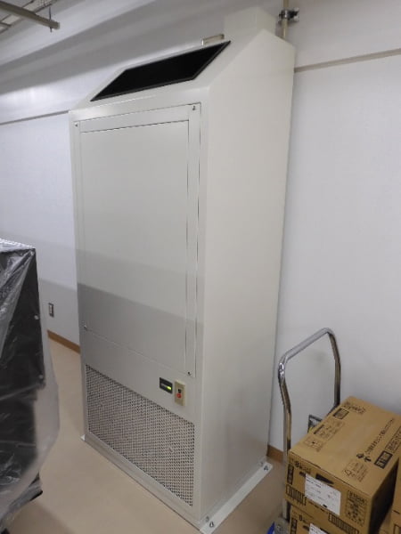 市販のパッケージエアコンに、オプションのヘパフィルタユニットを乗せ、市販の加湿器を外付けしております。右側は、外気(OA)の取入ユニットです。