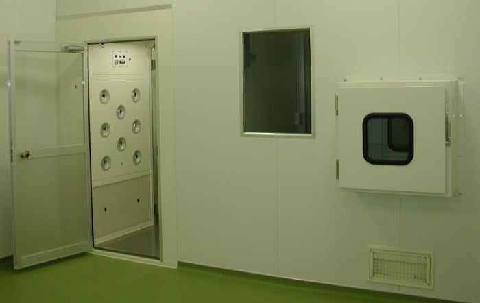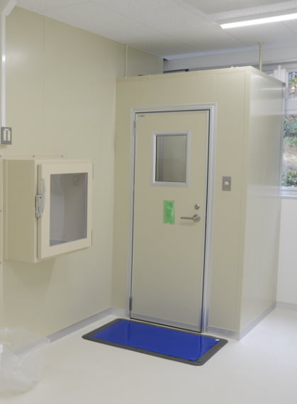 クリーンルームへの出入りは最小限にする必要があります。パスボックスは物品の受け渡しをするための箱で壁面に取り付けます。エアロックの働きをし、クリーンルーム内への塵埃の進入を最小限にくい止めます。