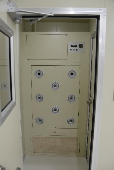 クリーンルームの出入り口で、HEPAフィルタで無塵化したジェット気流により体に付着したゴミを吹き飛ばします。エアロックの働きもするので、クリーンルーム内への塵埃の進入を最小限にくい止めます。