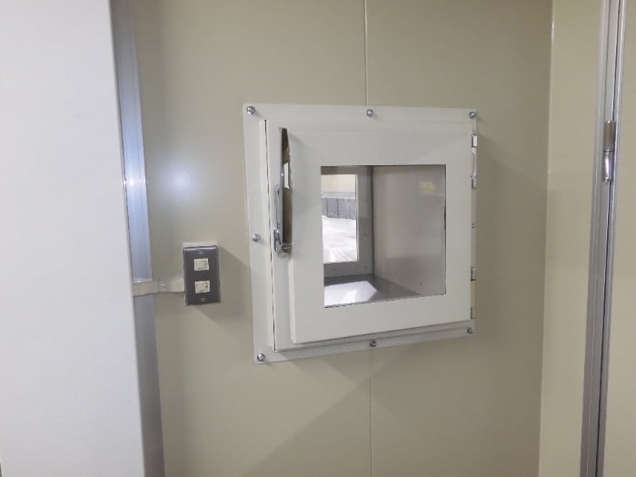 部品や製品をやり取りする為の小窓です。両方の扉を同時に開くと、外気が入り込みますから、扉はインターロックされており、片方ずつしか扉が開かない構造になっています。