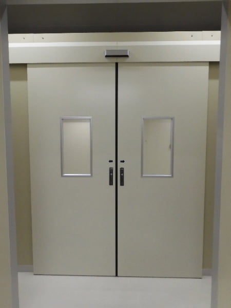 出入口は狭いので、この外に、機器搬入用の大扉を取付けするのが一般的です。