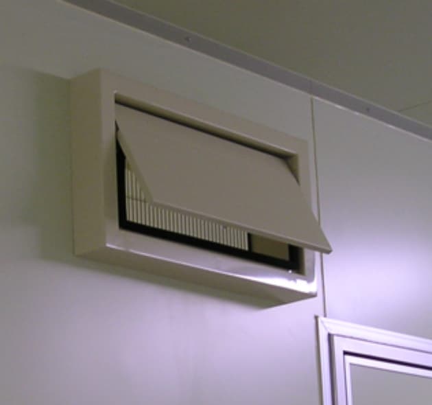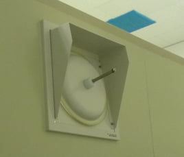 外気の導入により室内は陽圧になりますから、圧力が高まると、この様な陽圧ダンパから排気をさせています。ダンパの重りの移動により、室内の微陽圧が調整できます。