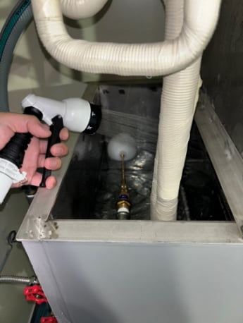 空調機のメンテナンス面のパネルを外して手動排水バルブを開き、水槽の底に溜まった不純物をノズルで洗い流すだけでメンテナンスは完了します。特別な技術も必要ありません。