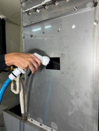 弊社の空調機の内部には、最初から清掃用のノズルとホース、手動洗浄バルブが標準装備されております。お客様がご自身で定期清掃するのにも、特別な道具は必要ありません。