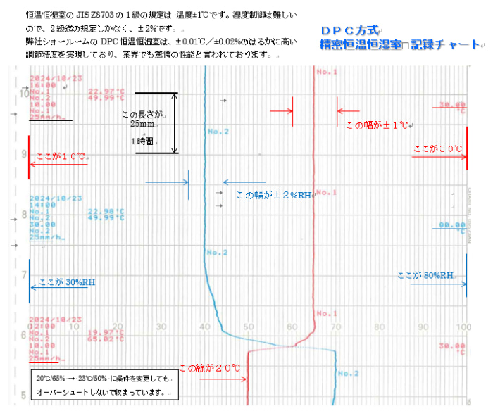 参考に添付した記録チャートは、弊社に有るかなり古い標準品のレンタル設備の物ですが、温度±0.01℃、湿度±0.02%の高精度を得ています。