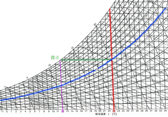 この地点から、真っ直ぐ緑線を左に移動してぶつかった地点が、この空気の露点と呼ばれ、その温度は約12℃です。この露点の相対湿度は100%で、もうこれ以上、空気中に水分が溶け込めない限界の状態を示します。